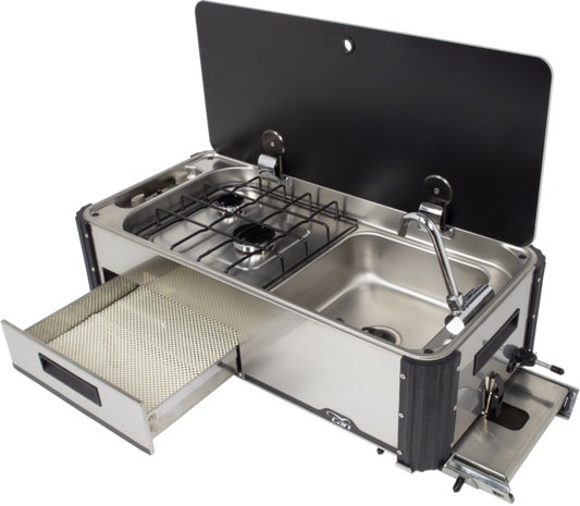 Kaitlentės / kriauklės blokas CAN Slide Out 2 Brenner, ištraukiamas išilginis, įsk. čiaupas, teleskopo kojelės