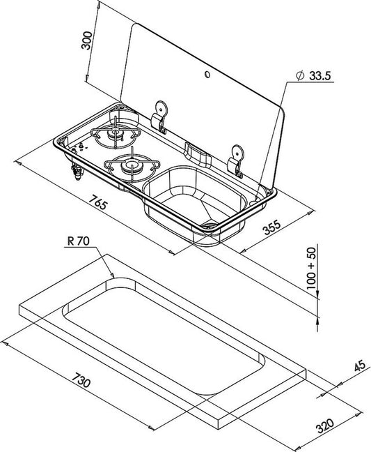 Integruotas kaitlentės / kriauklės blokas Thetford Topline 111 su elektriniu uždegimu