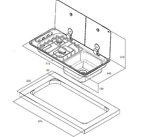 CAN virimo/kriauklės derinys 2 degiklių, kriaukle dešinė, stiklas 1 dalis
