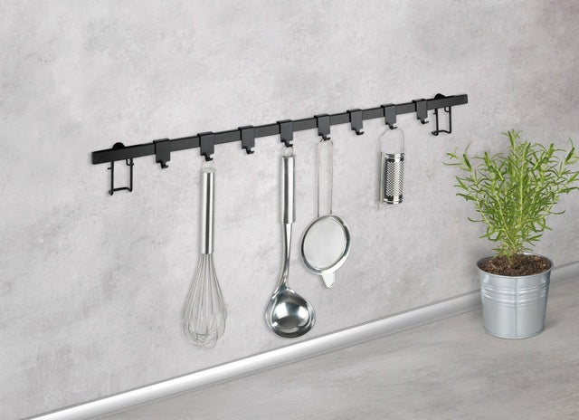 Kabliukų lentyna su aštuoniais kabliukais, kad virtuvėje būtų tvarkinga. Elegantiškas dizainas dėl juodo plokščio plieno. Galima montuoti ir be grąžto.