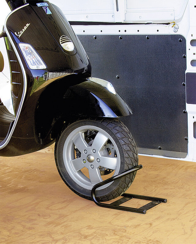 Motociklo/paspirtuko padangų užrakinimo sistema. Leidžia padangas iki maks. 18 cm plotis turi būti tvirtinamas. Juodai dažytas plienas.
